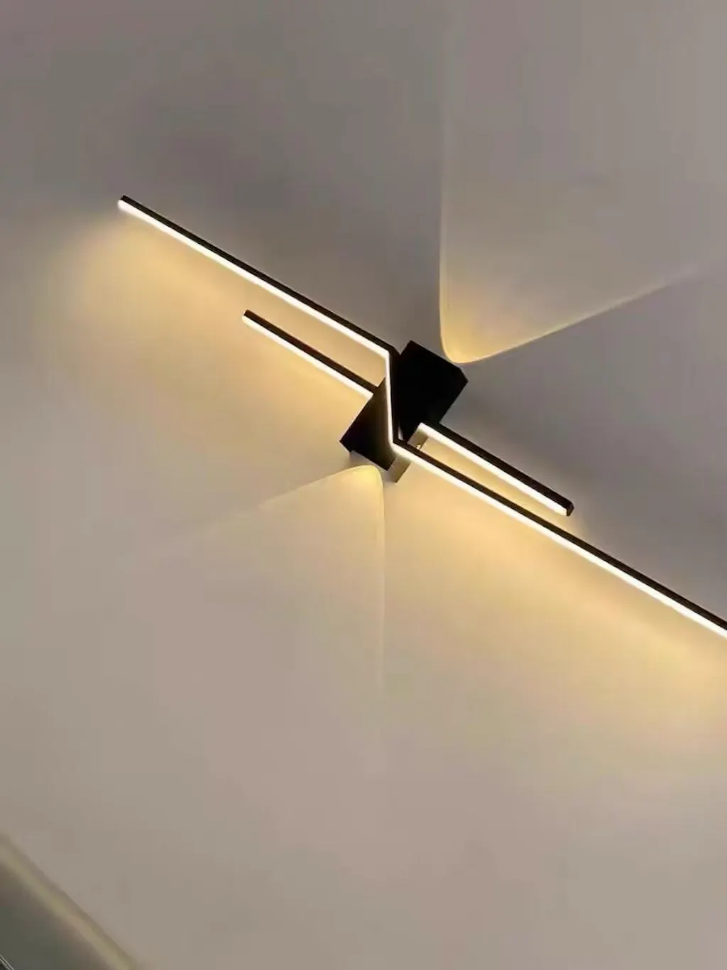 > Deze moderne wandlamp bestaat uit twee onregelmatige, lineaire lichtbalken die op een metalen kap zijn gemonteerd en is een trendy en opvallende verschijning voor elke ruimte.