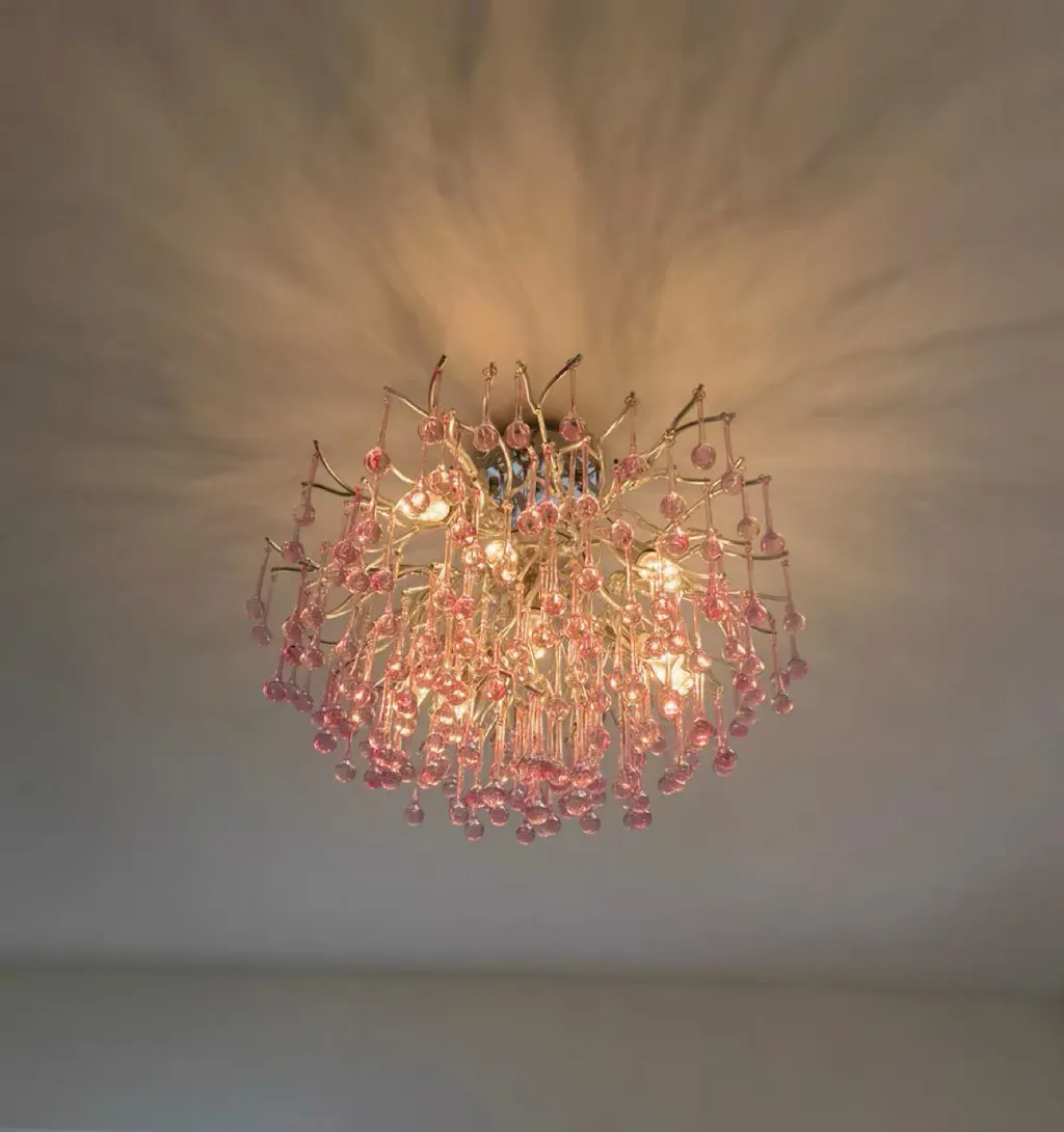 > De rosa kristallregndropparna är upplysta för att presentera skönheten i ljus och skugga med elegans och tydlighet.